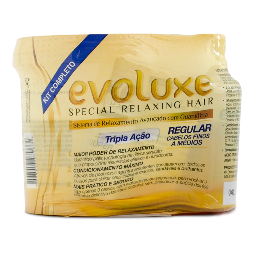 O Kit Evoluxe com Guanidina permite a modelagem do cabelo conforme o desejado, relaxando ou alisando os fios.