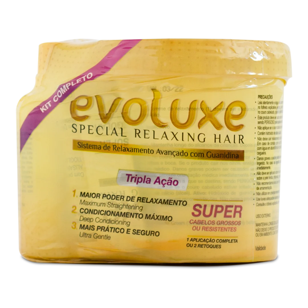 Descubra mais sobre Kit de Relaxamento Econômico Evoluxe Super – Com Guanidina (3 Produtos) Kit de Relaxamento para cabelos crespos ou cacheados, grossos ou médios, volumosos e resistentes. Relaxa e alisa os fios, além de controlar o volume. Fórmula moderna com tripla ação, conta com alta tecnologia que relaxa os cabelos de forma prática e segura, garantindo ótimo resultado e condicionamento máximo em todos os passos. É ideal para uma aplicação completa ou 2 retoques. O Kit Evoluxe com Guanidina permite a modelagem do cabelo conforme o desejado, relaxando ou alisando os fios. Seu princípio ativo age no interior do fio alinhando a estrutura do cabelo de forma segura e saudável, garantindo resultados satisfatórios como brilho e maciez. Este kit contém: Creme de relaxamento 225g – controla o volume, suaviza as ondas e proporciona efeito liso aos fios. Ativador Líquido Força Super 64mL – combinado com o creme de relaxamento, promove o relaxamento dos fios médios ou grossos que sejam resistentes aos processos de alisamento. Shampoo Indicador 80mL – Promove a limpeza e a retirada do produto dos fios de forma suave e sem agredir os mesmos. Formulado com ativos que proporcionam maciez, brilho e fechamento das cutículas, deixando os cabelos saudáveis após o procedimento químico.