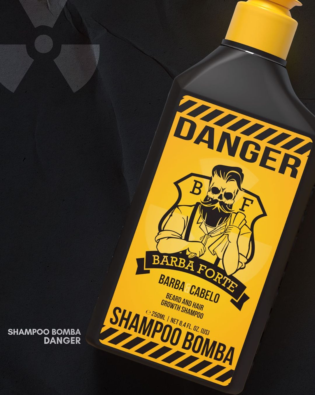 O Shampoo Bomba Danger Barba Forte é sem sombras de dúvidas o melhor e mais sinistro produto para cuidados de Barba & Cabelo que você já viu. Elaborado com uma mistura insana de ativos benéficos aos pelos, rosto e couro cabeludo, este produto vai estimular o crescimento dos fios da Barba & Cabelo, hidratar, reconstruir, promover brilho e maciez além de ajudar a combater a caspa.